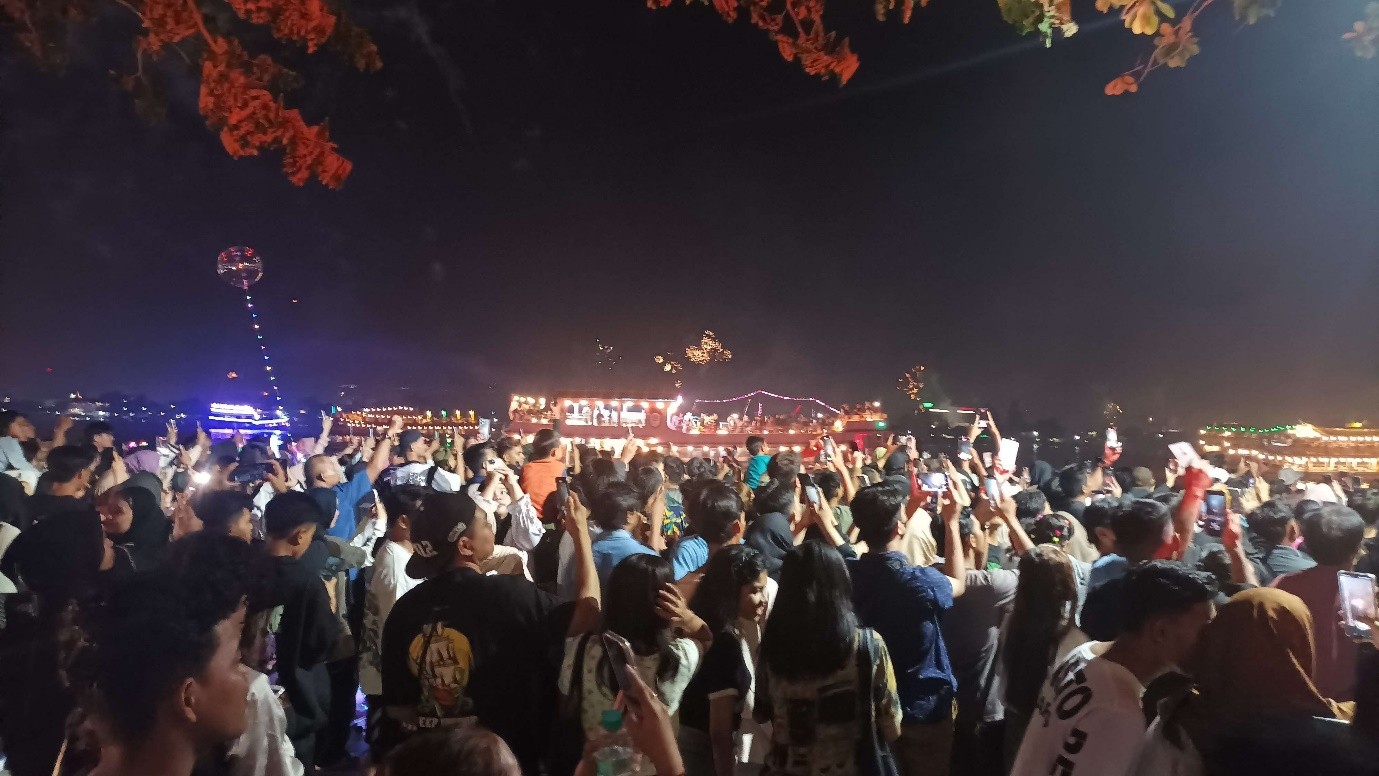 “Tahun ini lebih asyik di sini (Teras Samarinda). Suasananya lebih rapi, tidak sepadat tahun-tahun lalu yang macet parah. Bisa jalan kaki sambil menikmati angin sungai,” ujar Fahri (24), salah satu warga yang datang bersama kawan-kawannya.